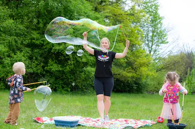 - Bogaty sprzęt i gadżety (bańki, chusta, wata cukrowa)